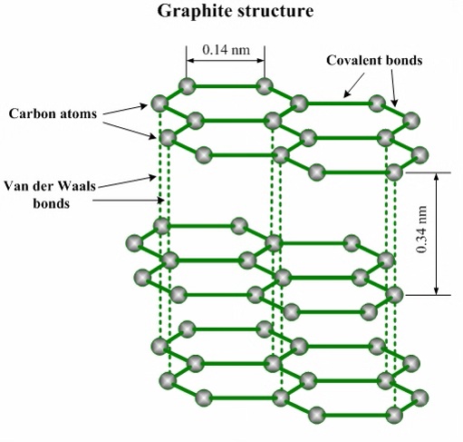 3. 石墨晶体中层与层之间相隔距离较大( 335pm ),以范德华力相结合