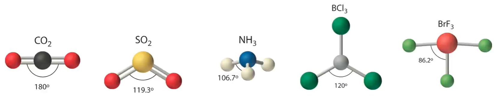 2. 中心原子存在孤电子对,对成键电子对有较大的排斥力,键角减小(半径相等时孤对电子分割更多圆周角)
